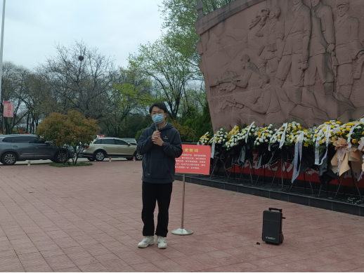 院党委副书记在人民烈士雕像前讲了《缅怀先烈 致敬英雄》的微党课。她表示,是革命先烈的伟大牺牲,才铸就了现在的繁荣祥和,这盛世亦如他们所愿。英烈的事迹和精神是中华民族的共同历史的记忆和宝贵的精神财富,作为青年一代,要继承和弘扬革命先烈伟大的无私奉献和英勇牺牲的精神,为实现中华民族的伟大复兴而努力奋斗,贡献青春力量。