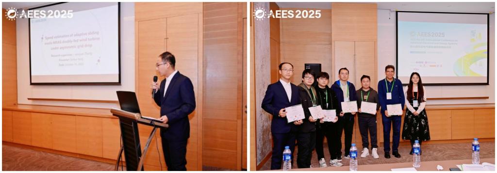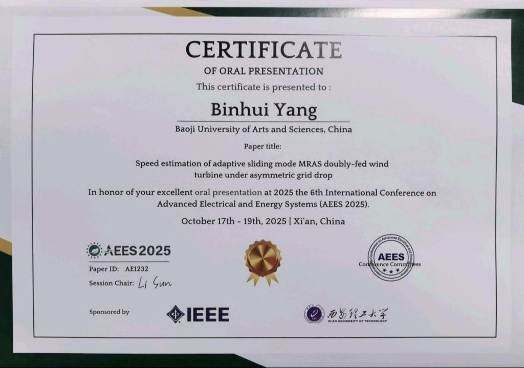 张文娟教授指导的研究生杨博宇、杨秉辉提交的论文《Speed estimation of adaptive sliding mode MRAS doubly-fed wind turbine under asymmetric grid drop》,经专家严格初审与复审后,成功入选AEES会议报告。杨秉辉在小组发言环节中,清晰阐述了研究成果的核心内容与创新点,并与会议专家展开深入交流研讨,充分展现了我院研究生在学术研究中的创新能力与实践水平。