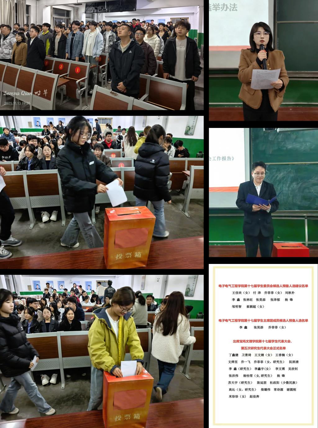 随后,李倩宣读了《宝鸡文理学院电子电气工程学院第十七次学生代表大会、第五次研究生大会代表选举办法》。会上,选举产生了电子电气工程学院第十七届学生委员会委员、主席团成员,出席宝鸡文理学院第十七次学生代表大会、第五次研究生代表大会正式代表。(文、图/耿硕璘 审核/张锐)